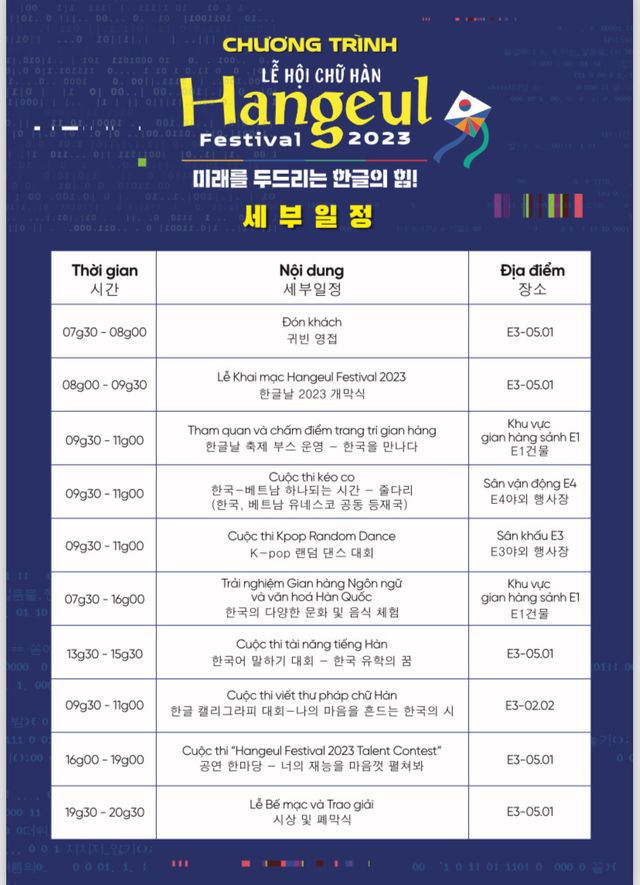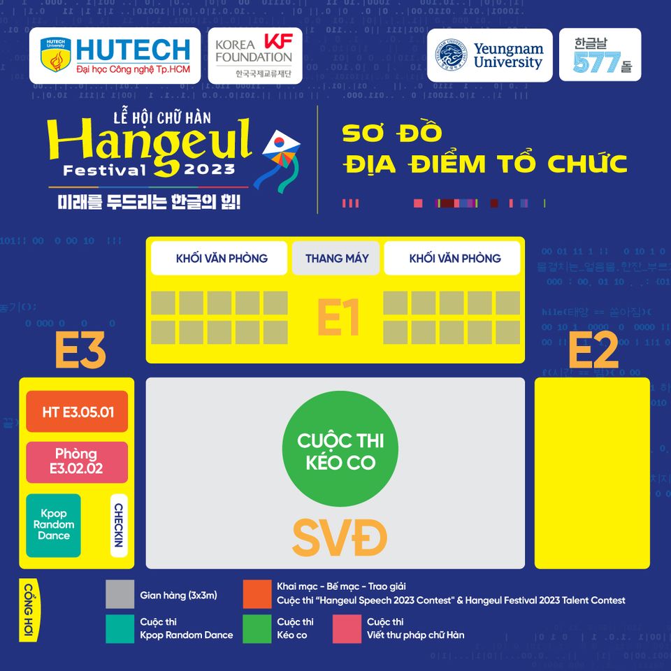 Đây được xem là sân chơi giao lưu văn hóa cực thú vị dành cho các bạn sinh viên yêu thích ngôn ngữ , đất nước và con người ở "xứ sở kim chi". Lễ hội lần này hứa hẹn sẽ đem đến những không gian đầy màu sắc và hàng loạt các hoạt động thi tài mang dấu ấn trải nghiệm văn hóa Hàn Quốc như: cuộc thi Thiết kế Áo đồng phục, cuộc thi Trang trí gian hàng, cuộc thi Kpop Random Dance, cuộc thi tài năng tiếng Hàn “Hangeul Speech Contest”, cuộc thi Kéo co, cuộc thi viết thư pháp chữ Hàn, cuộc thi “Hangeul Festival 2023 Talent Contest”.