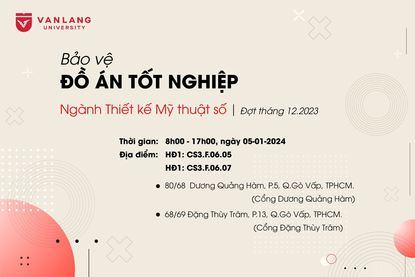 Ngày 05/01/2024 sắp tới, Ngành Thiết kế Mỹ thuật số sẽ tổ chức buổi Bảo vệ tốt nghiệp đợt 2, khóa K25 - Đồ họa Truyền thông tương tác, năm học 2022-2023.