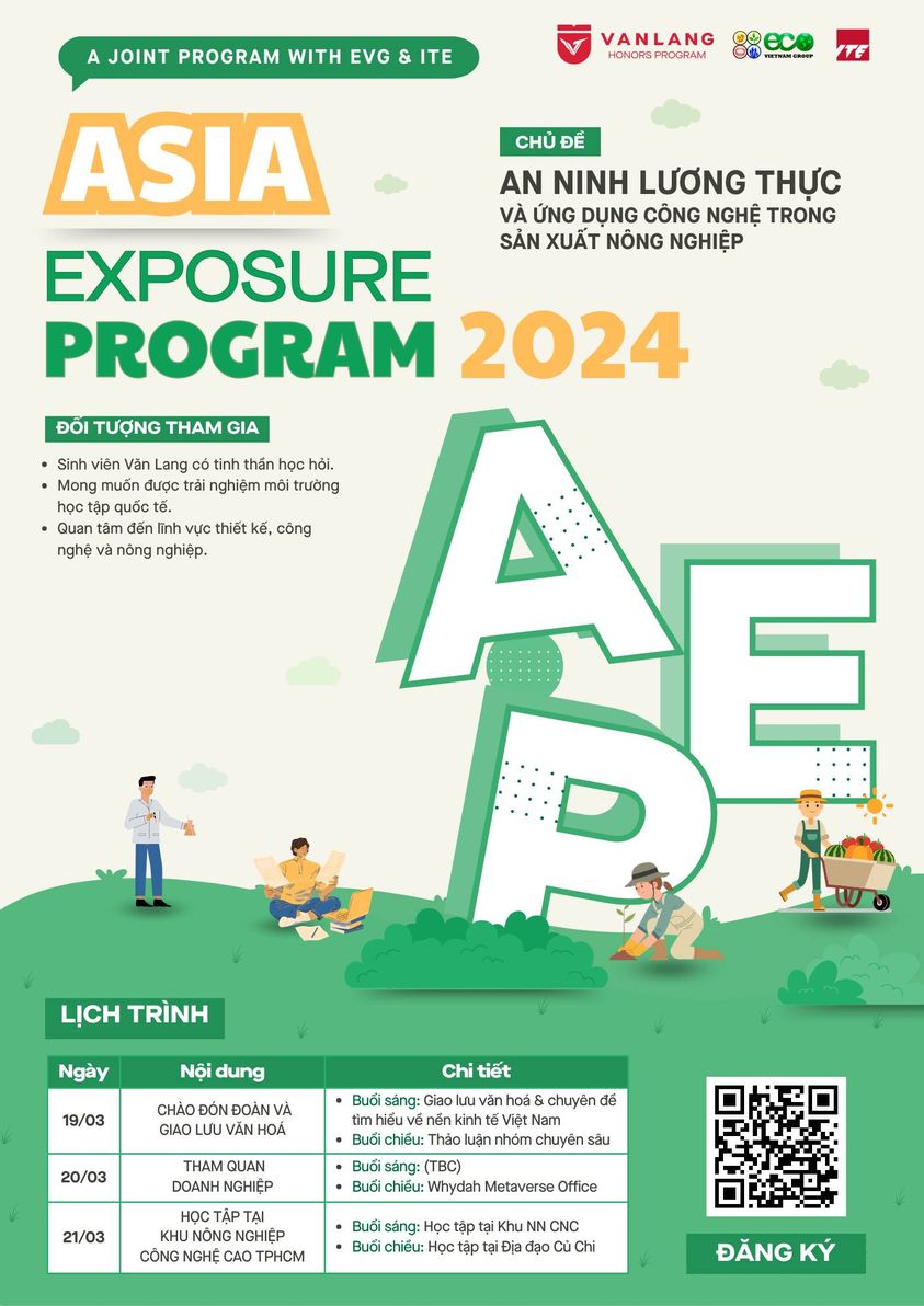 Asia-Exposure Program - AEP là hoạt động của Honors Program kết hợp với trường Institute of Technical Education (Singapore) và đối tác cộng đồng ECO Vietnam Group nhằm mang đến sinh viên thật nhiều kiến thức, đặc biệt là về chủ đề liên quan đến an ninh lương thực và ứng dụng công nghệ trong sản xuất nông nghiệp, cũng như là kiến thức về xã hội, giáo dục và kinh tế Việt Nam.