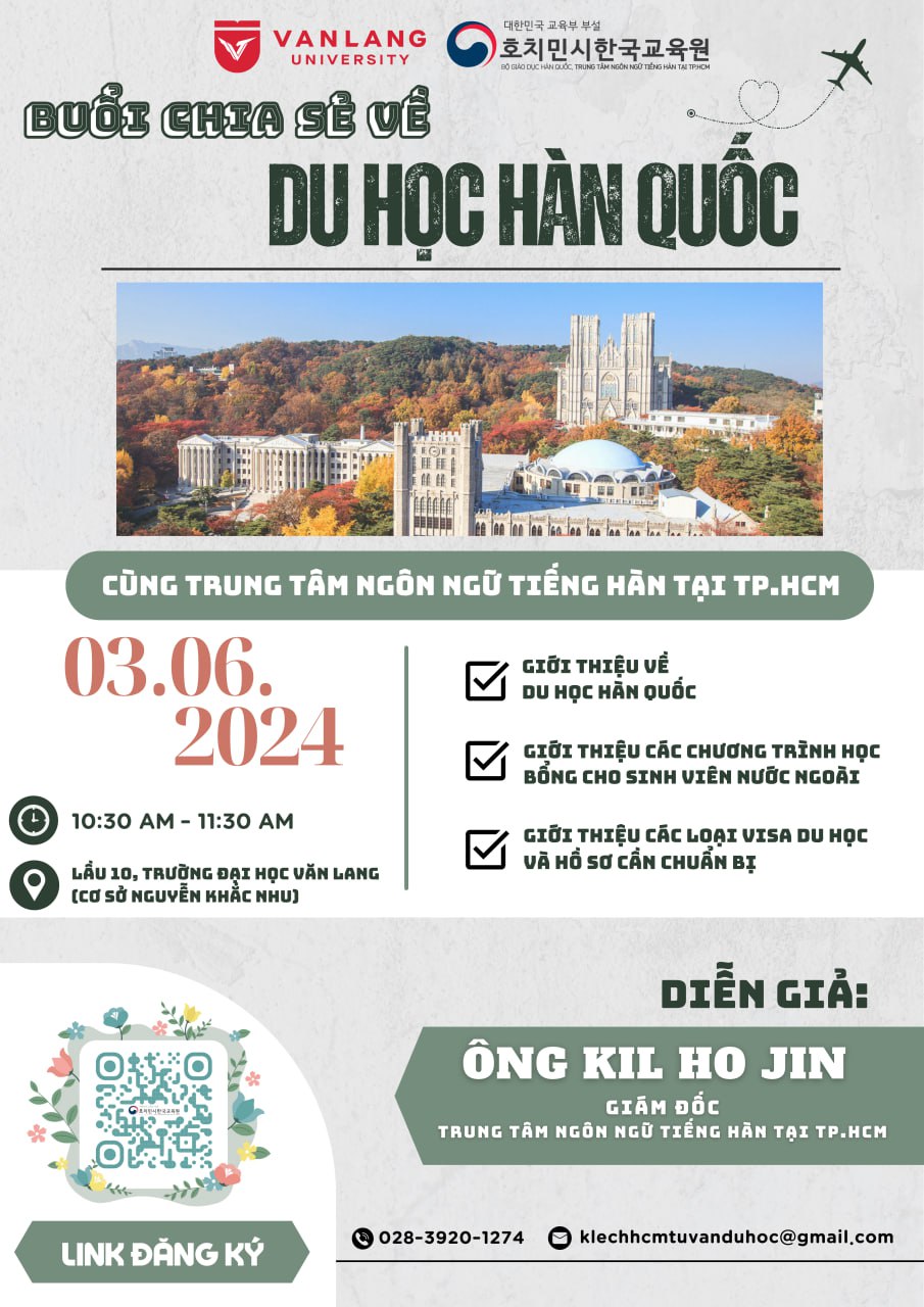 Trung tâm ngôn ngữ tiếng Hàn tại TP.HCM trực thuộc Bộ Giáo Dục Hàn Quốc sẽ có buổi Hội thảo du học đặc biệt cùng viện trưởng của trung tâm nhằm giúp các bạn sinh viên khắp miền nam Việt Nam, các bậc phụ huynh có quan tâm đến du học Hàn Quốc có được những thông tin chính xác về du học, sinh hoạt, đời sống khi du học tại Hàn Quốc.
