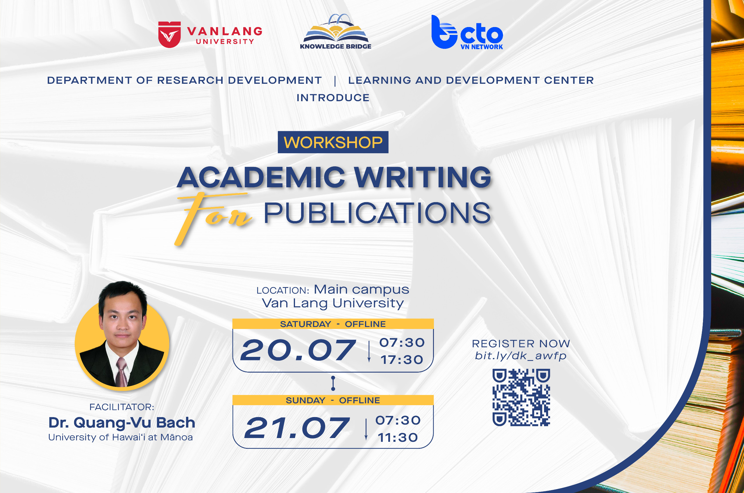 Phòng Phát triển Nghiên cứu Khoa học, Trung tâm Đào tạo và Phát triển - Trường Đại học Văn Lang phối hợp cùng Viện Nhịp Cầu Tri Thức (KBERI) trân trọng giới thiệu Workshop "Academic Writing for Publications" được tổ chức dành cho Quý Thầy/Cô quan tâm đến kỹ năng viết học thuật và xuất bản nghiên cứu, đặc biệt là đội ngũ Giảng viên, Nghiên cứu viên tại Trường Đại học Văn Lang với thông tin chi tiết như bên dưới.
