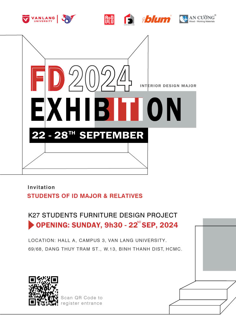 Triển lãm FD (Furniture Design) là triển lãm thường niên của ngành Thiết kế Nội thất trường Đại học Văn Lang. Triển lãm FD 2024 là triển lãm đồ án thiết kế trang thiết bị nội thất sinh viên K27 TKNT.