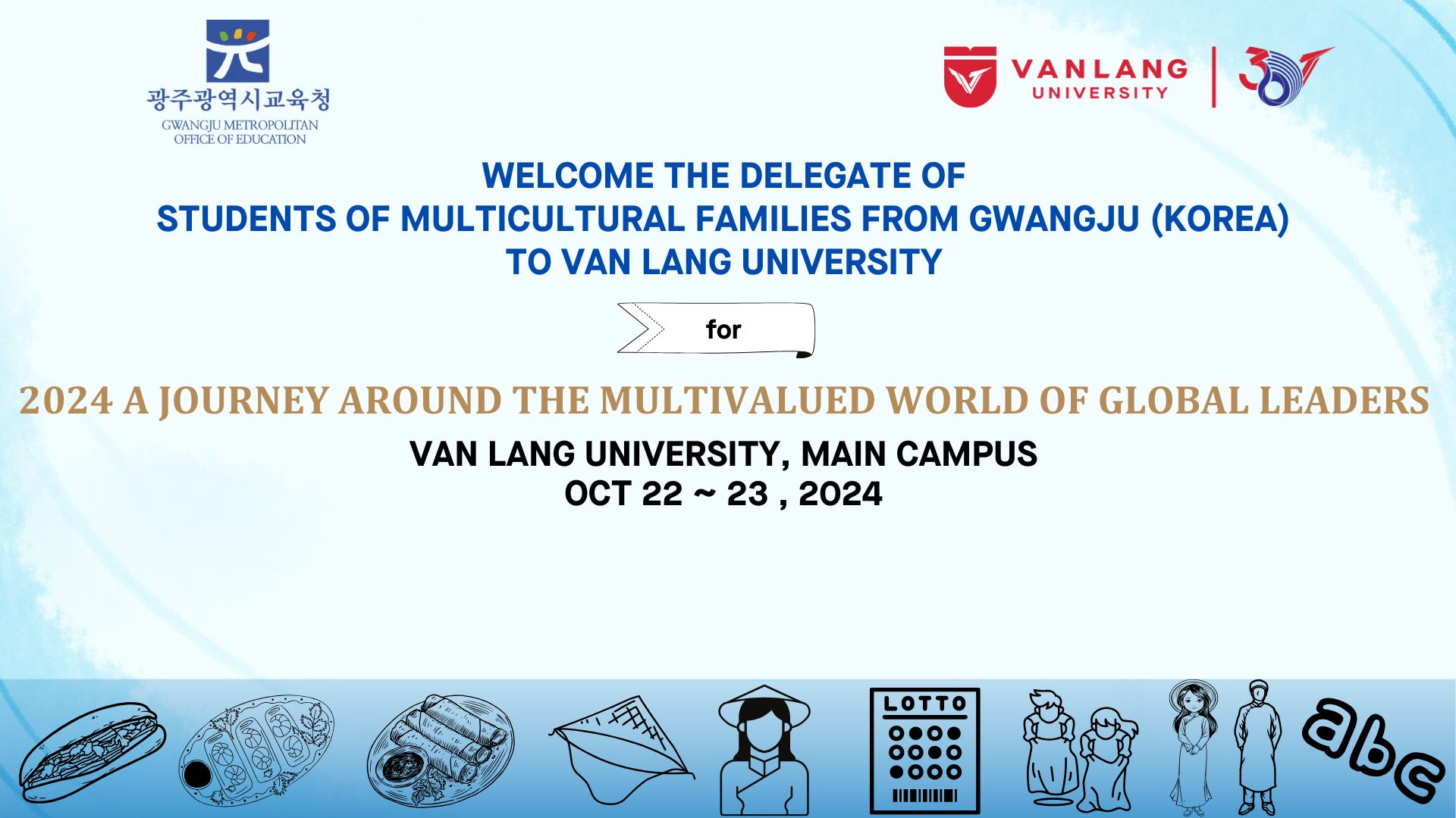 Chương trình “Vòng quanh thế giới đa sắc màu của nhà lãnh đạo toàn cầu 2024” (2024 글로벌 리더 다가치 세계 한 바퀴”) do Sở Giáo dục tỉnh Gwangju phối hợp với Trường Đại học Văn Lang tổ chức nhằm ạo điều kiện cho học sinh trong gia đình đa văn hóa Việt – Hàn hiểu thêm về văn hóa Việt Nam – quê hương của bố/ mẹ mình để từ đó giúp nuôi dưỡng lòng yêu quê hương và tự hào về quê hương thứ hai của các em.
