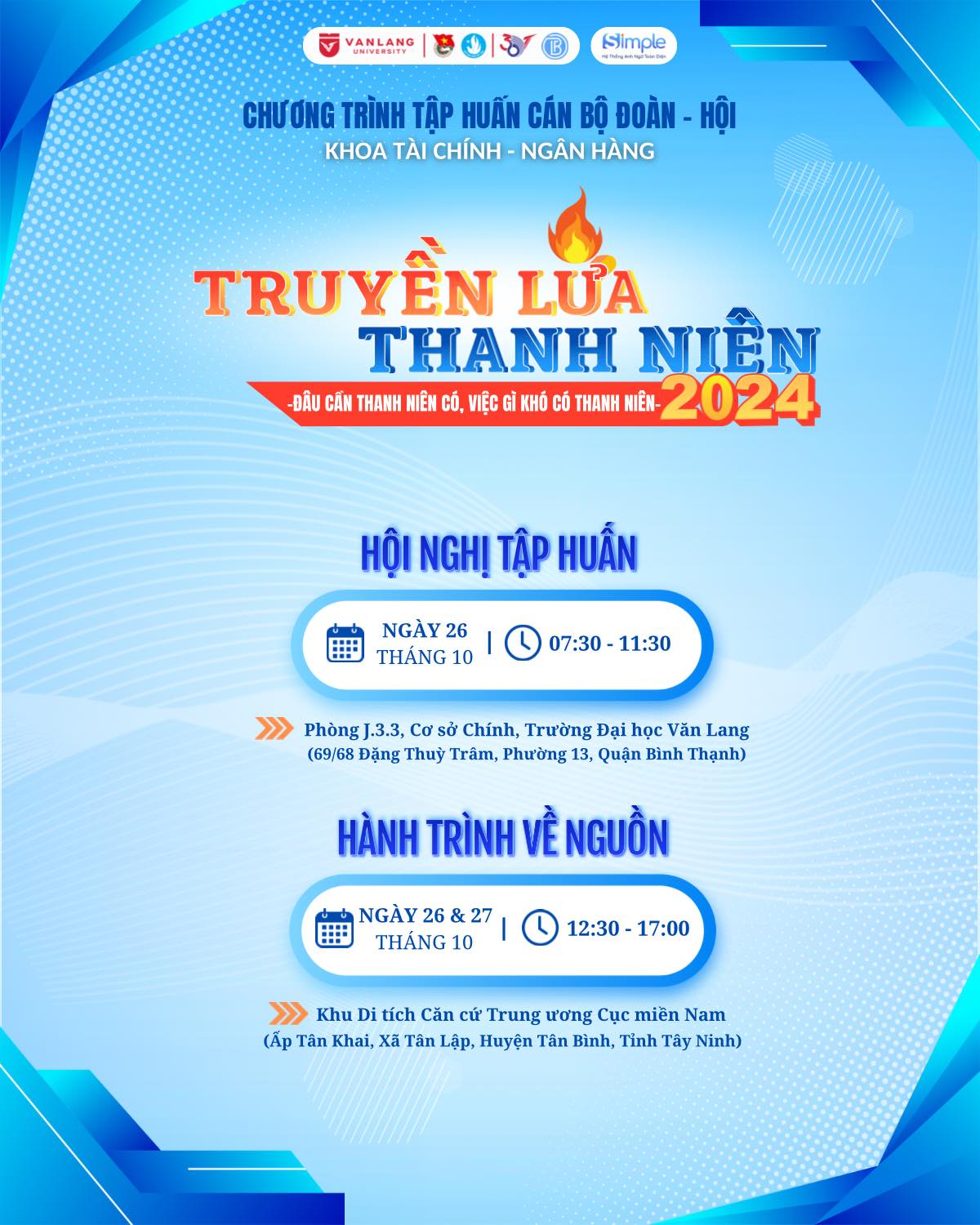 Chương trình Tập huấn Cán bộ Đoàn - Hội - “Truyền lửa thanh niên” không chỉ là một buổi Tập huấn đơn thuần mà còn là nơi thắp sáng ngọn lửa nhiệt huyết, là chiếc chìa khóa mở ra những cánh cửa cơ hội mới. Đến đây, bạn sẽ được trang bị hành trang kiến thức vững chắc, rèn luyện kỹ năng mềm và kết nối với những tâm hồn đồng điệu. Đừng bỏ lỡ cơ hội trở thành phiên bản tốt nhất của chính mình!