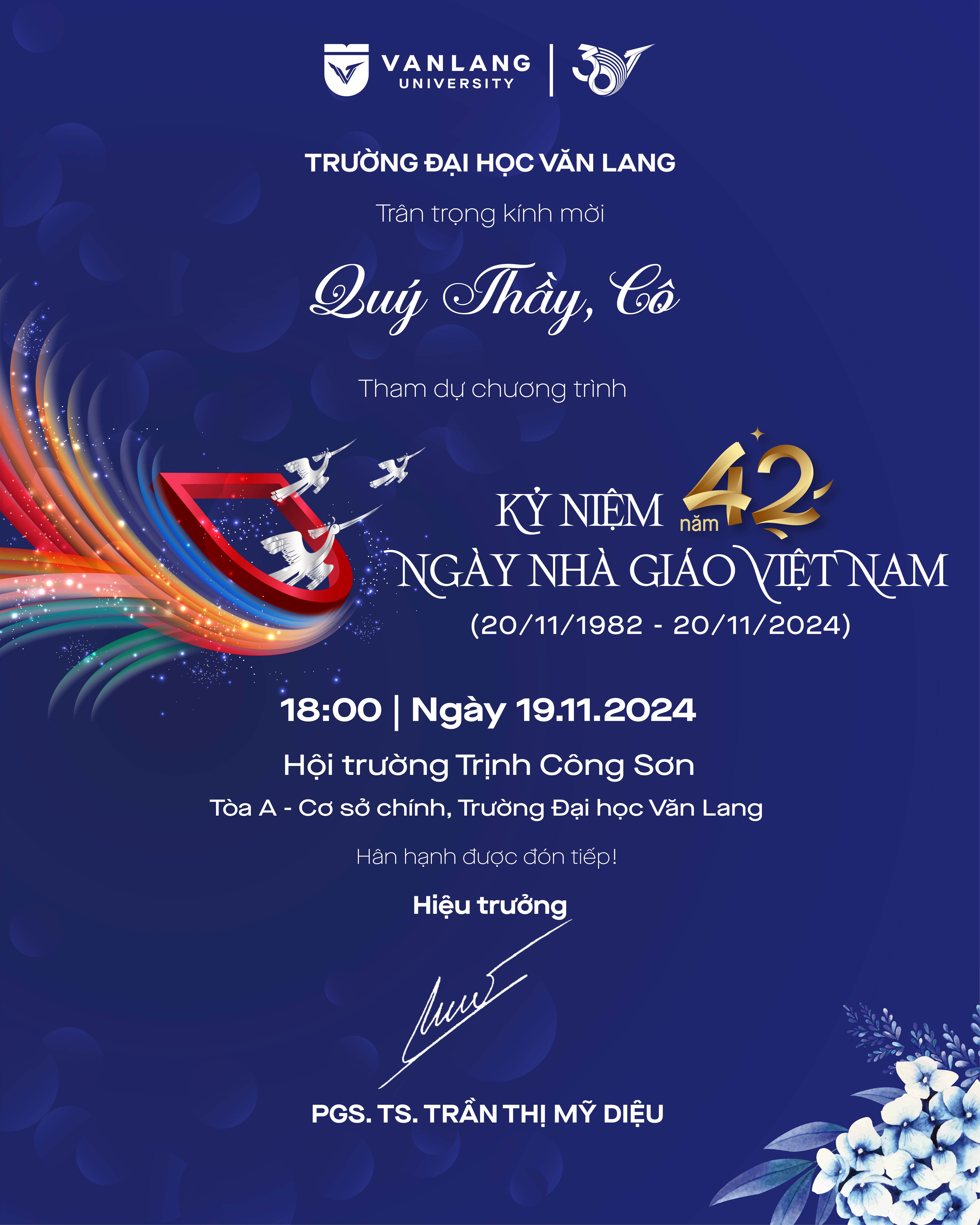 Trường Đại học Văn Lang luôn trân quý sự đóng góp và cống hiến của mỗi Thầy, Cô trên hành trình 30 năm phụng sự giáo dục. Nhân dịp kỷ niệm 42 năm ngày Nhà giáo Việt Nam (20/11/1982 - 20/11/2024), Trường Đại học Văn Lang trân trọng kính mời Cô tham dự Chương trình tri ân với thông tin cụ thể như sau: