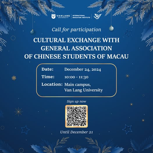 Vào ngày 24/12/2024, Viện Đào tạo Quốc tế hân hạnh đón tiếp đoàn Tổng hội học sinh, sinh viên Trung Quốc từ Macau (General Association of Chinese Students of Macau) đến thăm và giao lưu cùng sinh viên Văn Lang. Đây là cơ hội tuyệt vời để các thành viên nhà Xanh trứng sáo chúng ta cùng nhau chia sẻ văn hóa, kiến thức và mở rộng mạng lưới giao lưu quốc tế!