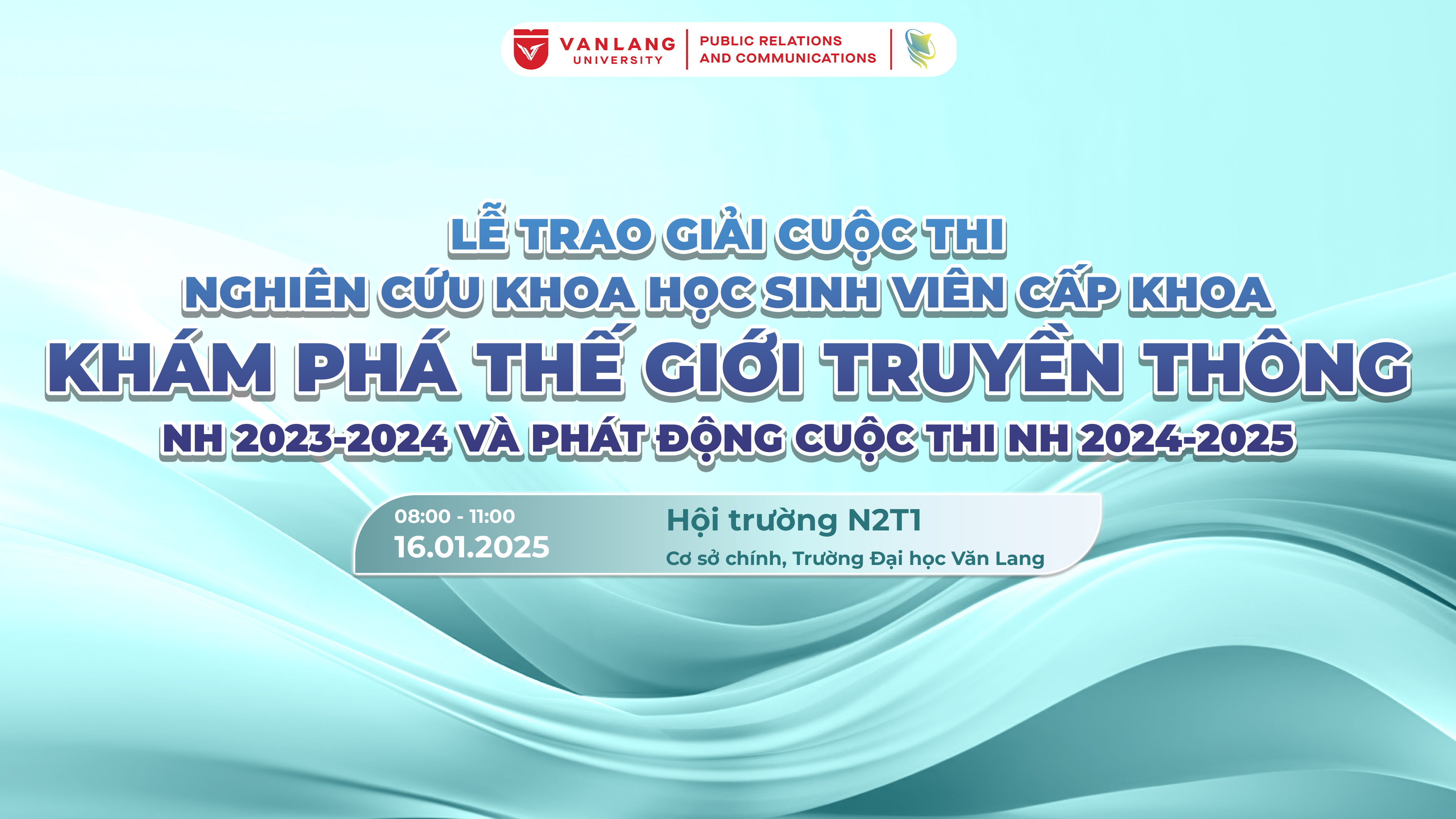 Khoa Quan hệ Công chúng - Truyền thông, Trường Đại học Văn Lang, trân trọng thông báo tổ chức Lễ trao giải Cuộc thi Nghiên cứu Khoa học Sinh viên cấp Khoa “Khám phá thế giới truyền thông” năm học 2023-2024 và phát động Cuộc thi năm học 2024-2025.
