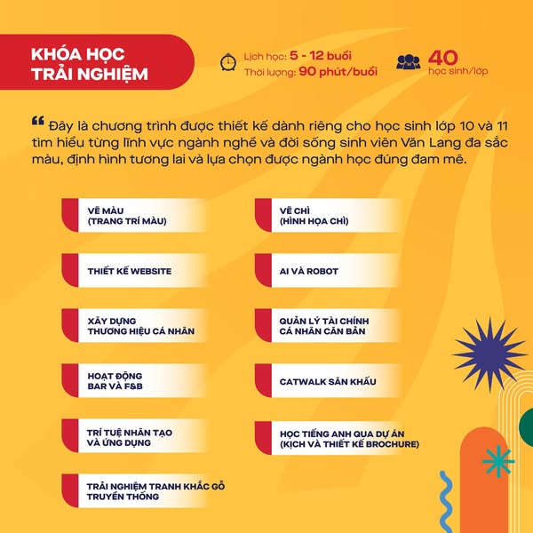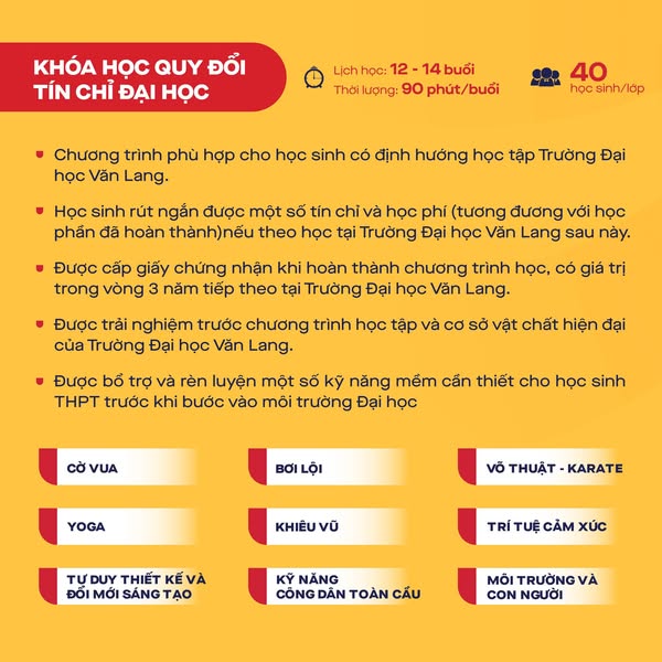 Với 20 khóa học được xây dựng theo chuẩn chương trình đại học, học sinh sẽ được tiếp cận các lĩnh vực đa dạng như kỹ năng mềm, nghệ thuật, công nghệ, giáo dục thể chất, tiếng Anh và tài chính cá nhân. Đặc biệt, một số môn học còn có thể quy đổi tín chỉ đại học, giúp các bạn tích lũy lợi thế khi trở thành sinh viên chính thức tại Văn Lang trong tương lai.