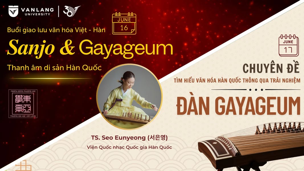 Ngành Đông phương học, Khoa Xã hội & Nhân văn, Trường Đại học Văn Lang trân trọng mang đến một chuỗi sự kiện giao lưu văn hóa Việt - Hàn không thể bỏ lỡ! Chương trình có sự góp mặt đặc biệt của TS. Seo Eunyeong - nghệ sĩ Gayageum tài năng đến từ Viện Quốc nhạc Quốc gia Hàn Quốc, cùng với sự hỗ trợ của ThS. Dương Bảo Khánh (phụ trách trống Janggu và phiên dịch).