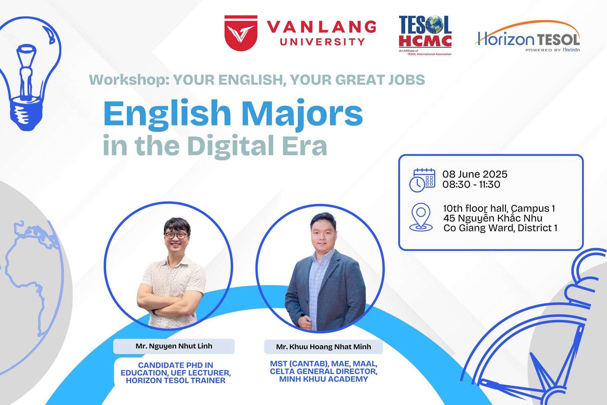 Khoa Ngoại ngữ phối hợp với Hội nghiên cứu và giảng dạy Tiếng Anh TPHCM và Horizon TESOL tổ chức hội thảo chuyên đề "YOUR ENGLISH, YOUR GREAT JOBS". Chương trình định hướng và bồi dưỡng nghiệp vụ giảng dạy cho những bạn trẻ muốn bước chân vào lĩnh vực dạy tiếng Anh với phần chia sẻ của các diễn giả có nhiều năm kinh nghiệm trong lĩnh vực TESOL, cụ thể như sau: