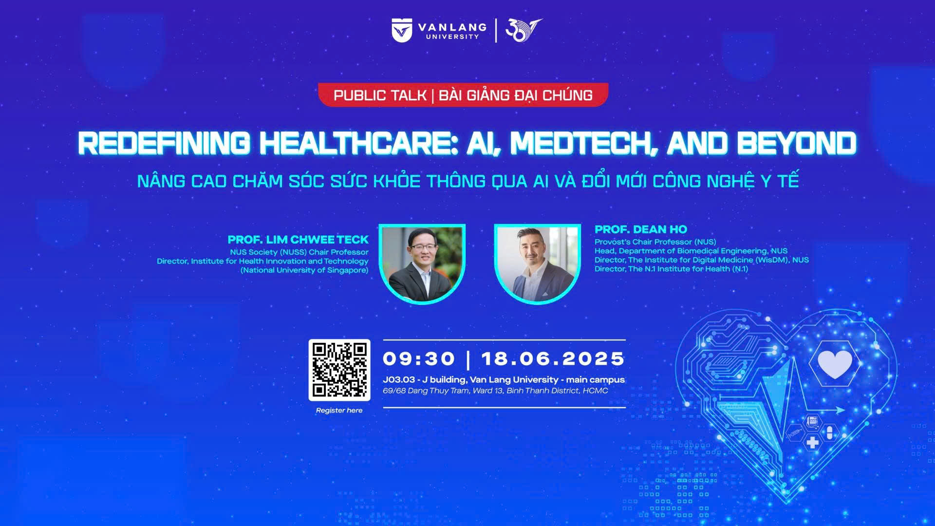 Trong khuôn khổ hợp tác giữa Trường Đại học Văn Lang và Đại học Quốc gia Singapore (National University of Singapore – NUS), Trường Đại học Văn Lang hân hạnh tổ chức một buổi giảng đặc biệt dành cho công chúng, với sự góp mặt của hai giáo sư hàng đầu đến từ NUS. Sự kiện nhằm chia sẻ những tiến bộ mới nhất trong nghiên cứu và ứng dụng thực tiễn trong lĩnh vực y học số và công nghệ y sinh.
