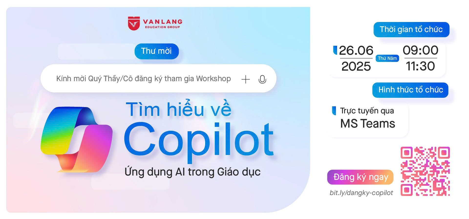 Trước sự phát triển nhanh chóng của công nghệ số, việc ứng dụng hiệu quả trí tuệ nhân tạo AI đang trở thành yếu tố giúp nâng cao hiệu suất và thúc đẩy đổi mới trong phương pháp giảng dạy và quản lý – theo hướng linh hoạt, chính xác và sáng tạo. Nhằm đồng hành cùng Quý Thầy/Cô trong hành trình nâng cao năng lực số và thúc đẩy chuyển đổi số giáo dục, hướng đến mục tiêu trường Đại học điển hình – Microsoft Showcase School của Văn Lang, Trung tâm Đào tạo và Phát triển trân trọng giới thiệu Workshop “Tìm hiểu về Copilot – Ứng dụng AI trong giáo dục”. Đây là nền tảng trợ lý ảo hiện đại, được tích hợp trong hệ sinh thái Microsoft và đang được ứng dụng rộng rãi, hiệu quả trong hoạt động giảng dạy và quản lý giáo dục. Tham gia Workshop, Thầy/Cô sẽ có cơ hội: Tìm hiểu cách Copilot tích hợp với Word, Excel, Outlook, MS Teams,… Khám phá các tình huống thực tiễn ứng dụng Copilot Chat trong giảng dạy và công việc; Nắm bắt các mẹo và công cụ hỗ trợ nâng cao hiệu suất, tư duy sáng tạo và khả năng ra quyết định; Trải nghiệm và được giải đáp các thắc mắc từ chuyên gia.