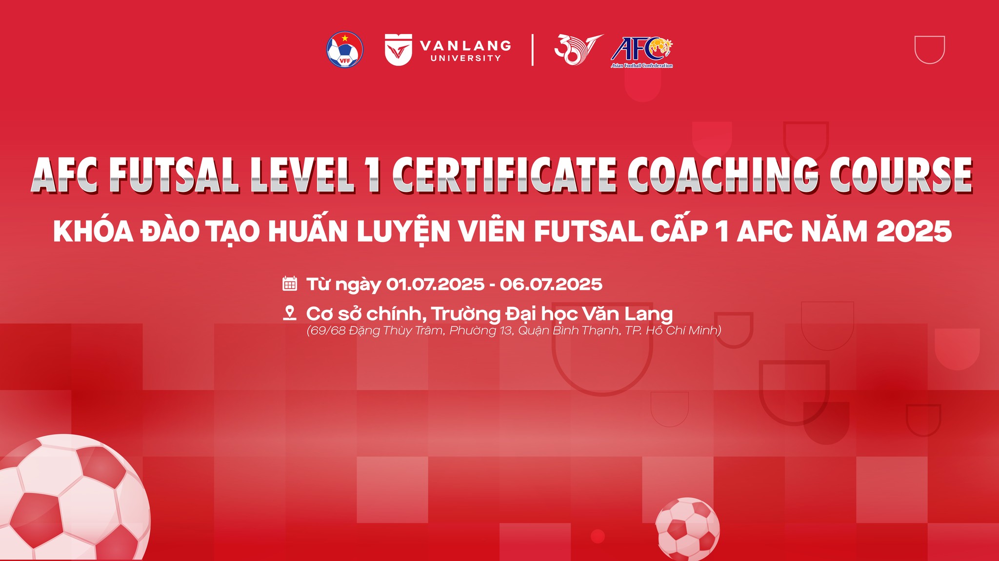 Từ ngày 01 – 06/07/2025, Khóa học đào tạo HLV Futsal Cấp 1 Châu Á do Liên đoàn Bóng đá Việt Nam (VFF) phối hợp với Liên đoàn Bóng đá Châu Á (AFC) sẽ được tổ chức tại Trường Đại học Văn Lang: