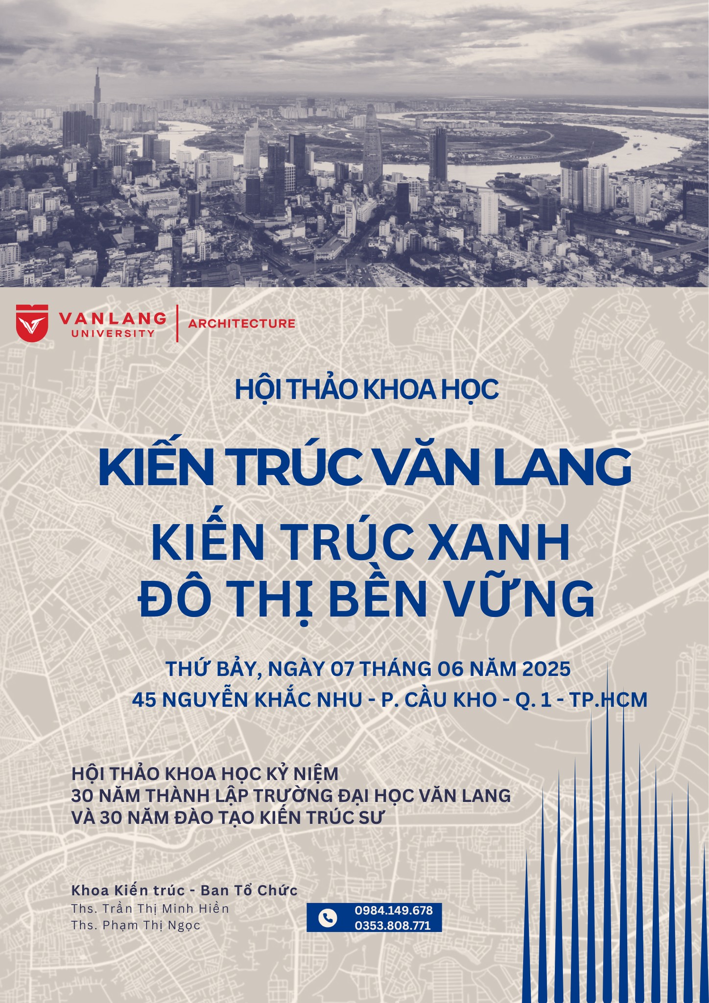 Hội thảo khoa học – năm 2025 nhằm mục đích giới thiệu những kết quả nghiên cứu khoa học trong thực tiễn chuyên môn của cán bộ giảng viên và học viên cao học. Đây cũng là dịp để Khoa Kiến trúc tập họp những bài viết, tham luận khoa học nhằm đóng góp cho Tuyển tập Chào mừng 30 năm đào tạo Kiến trúc sư của Trường Văn Lang. Đây cũng là tiền đề cho việc đẩy mạnh phong trào Nghiên cứu Khoa học của Giảng viên và Người học của Khoa Kiến trúc hướng tới định kỳ mỗi 2 năm sẽ tổ chức hội thảo khoa học và xuất bản 1 tuyển tập nghiên cứu.