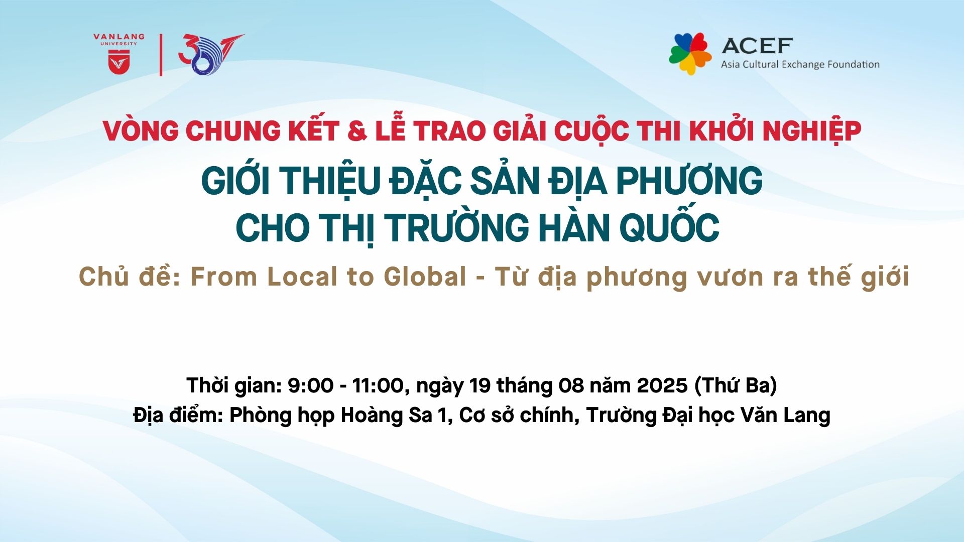 Hãy đến tham dự sự kiện “Vòng chung kết và Lễ trao giải Cuộc thi Khởi nghiệp: Giới thiệu đặc sản địa phương cho thị trường Hàn Quốc- Chủ đề: From Local to Global- Từ địa phương vươn ra thế giới” để cùng khám phá hành trình đầy sáng tạo và táo bạo của các bạn sinh viên Khoa Ngôn ngữ và Văn hóa Hàn Quốc, Đại học Văn Lang!