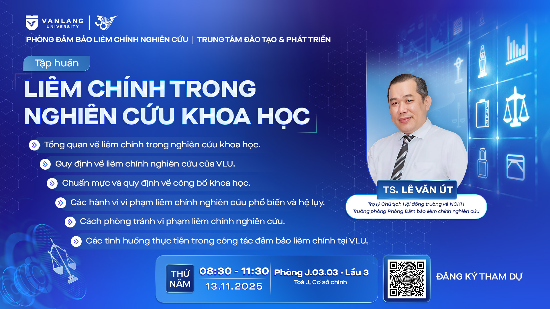 Nhằm tăng cường năng lực, củng cố nền tảng liêm chính và thực hành chuẩn mực trong nghiên cứu khoa học; đồng thời giúp Quý Thầy/Cô Giảng viên - Nghiên cứu viên Văn Lang hiểu rõ hơn về liêm chính nghiên cứu khoa học, qua đó góp phần phát triển nghiên cứu bền vững và xây dựng môi trường học thuật minh bạch, chuyên nghiệp, trên cơ sở phê duyệt của Hiệu trưởng, Phòng Đảm bảo liêm chính nghiên cứu (VRECO) phối hợp cùng Trung tâm Đào tạo & Phát triển trân trọng thông báo tổ chức chương trình Tập huấn “Liêm chính trong nghiên cứu khoa học” - Đợt 1, Năm học 2025-2026.