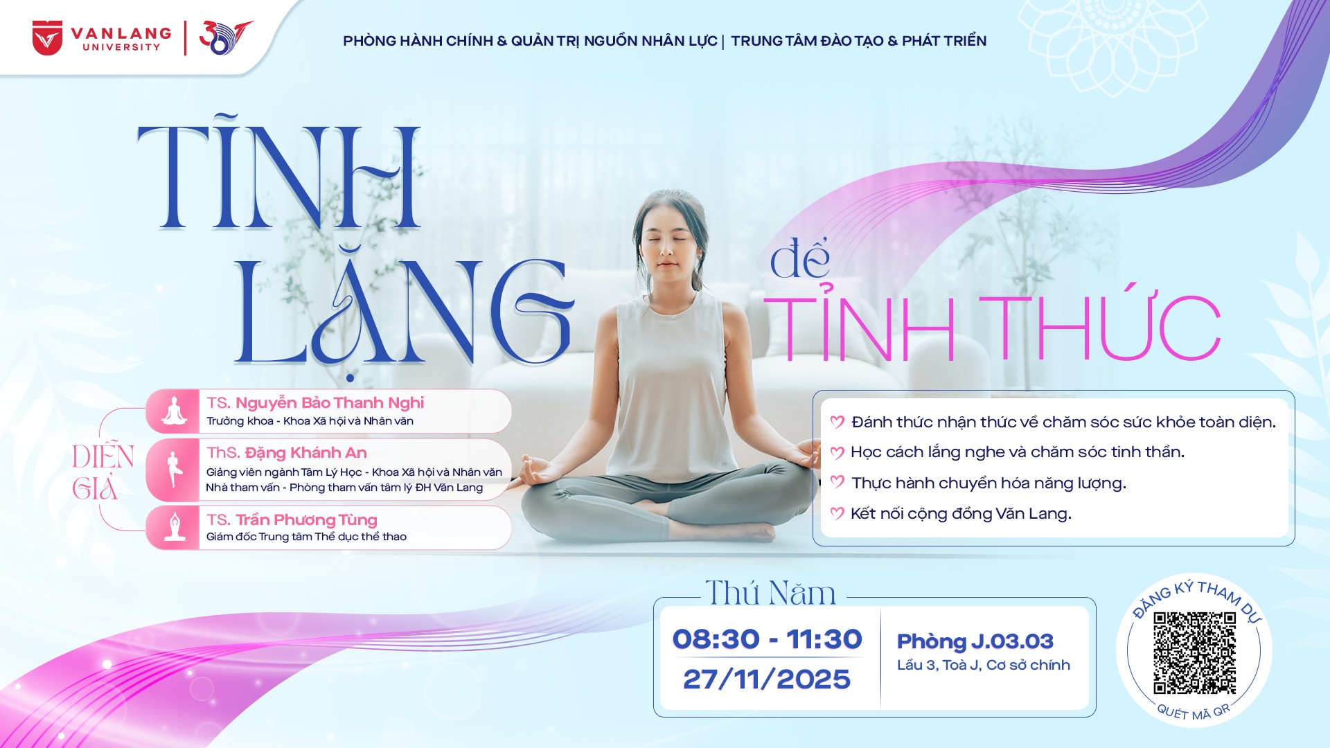 Thấu hiểu điều đó, Phòng Hành chính & Quản trị Nguồn nhân lực phối hợp cùng Trung tâm Đào tạo & Phát triển tổ chức Workshop “Tĩnh lặng để Tỉnh thức” với thông tin sau
