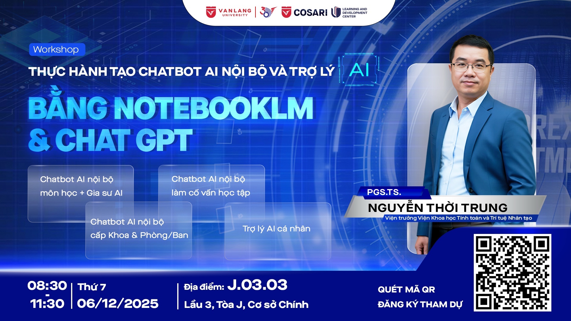 Trong bối cảnh trí tuệ nhân tạo (AI) đang trở thành công cụ hỗ trợ thiết thực trong giáo dục, nghiên cứu và quản trị, việc phát triển các Chatbot AI nội bộ và Trợ lý AI cá nhân hóa góp phần quan trọng trong việc nâng cao hiệu quả công việc, chia sẻ tri thức và hỗ trợ ra quyết định. Nhằm trang bị năng lực thực hành AI cho đội ngũ nhân sự tại Văn Lang và thúc đẩy hình thành hệ sinh thái “AI trong Nhà trường” - nơi mỗi cá nhân có thể chủ động tạo ra công cụ AI phục vụ công việc chuyên môn, Viện Khoa học Tính toán & Trí tuệ Nhân tạo, phối hợp cùng Trung tâm Đào tạo & Phát triển tổ chức Workshop “Thực hành tạo Chatbot AI nội bộ và Trợ lý AI bằng NotebookLM & ChatGPT”.