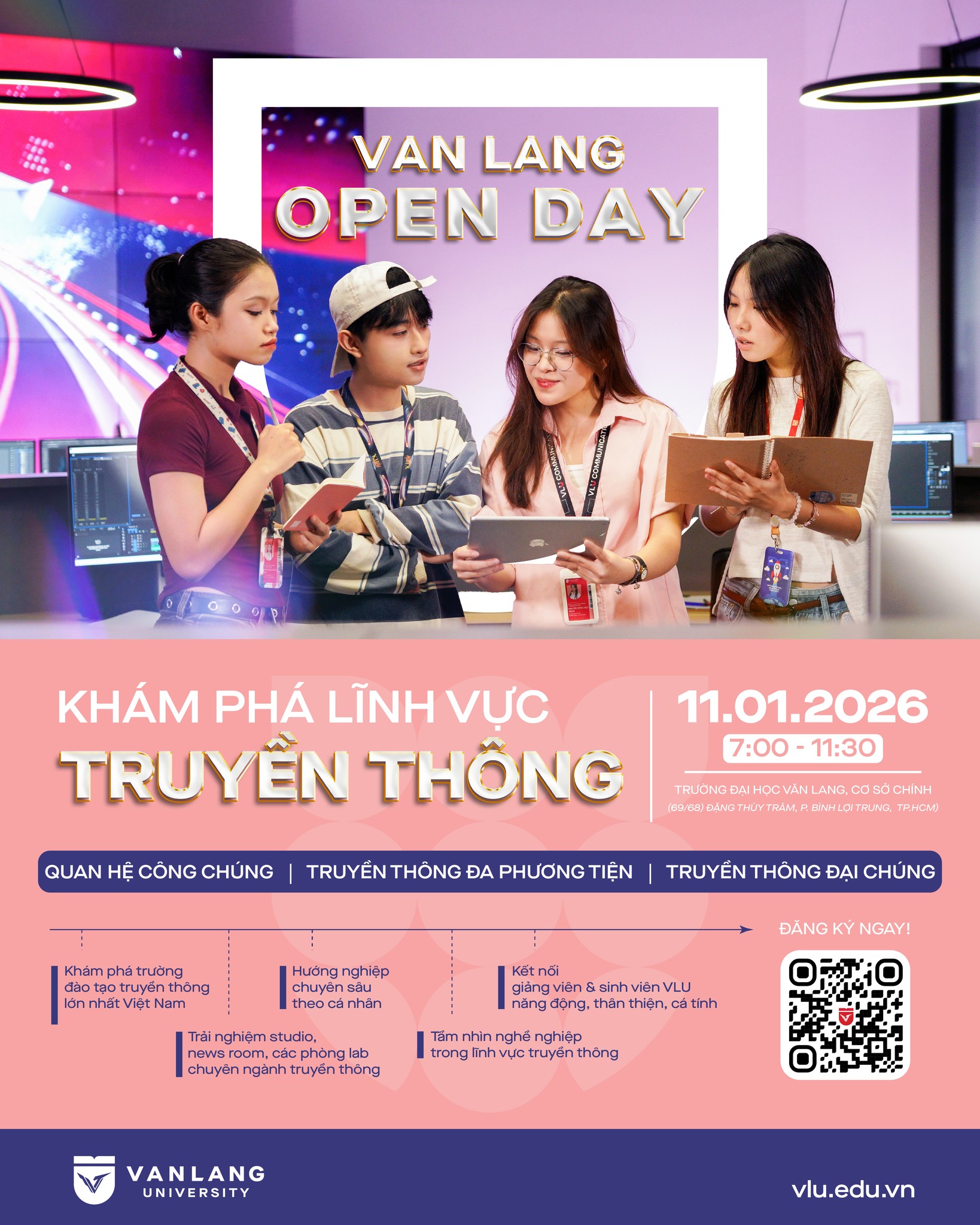 Chủ nhật này, ngày 11/01/2026, Trường Đại học Văn Lang tổ chức Open Day Khối ngành Truyền thông – chương trình trải nghiệm và định hướng chuyên sâu dành cho học sinh THPT quan tâm đến Truyền thông, PR, Nội dung sáng tạo và Truyền thông đa phương tiện.