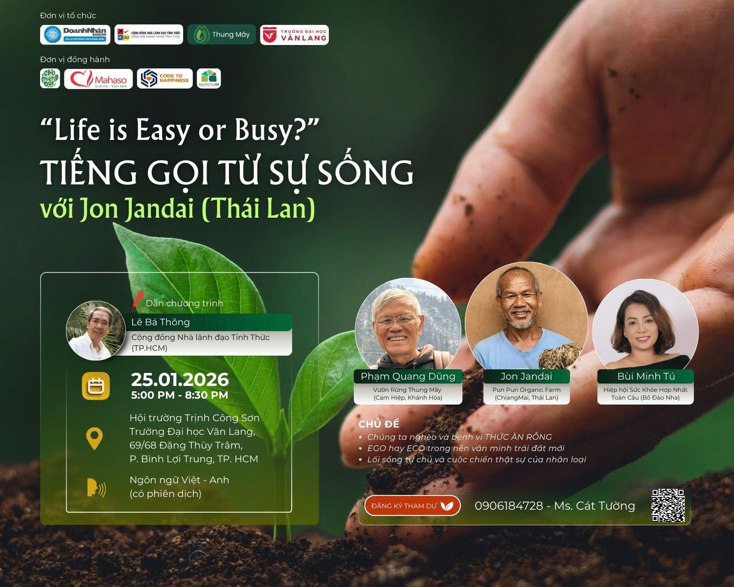 Chương trình “Life is Easy or Busy?” – Tiếng gọi từ sự sống với Jon Jandai. Chương trình mở ra không gian đối thoại sâu sắc, nơi sinh viên có cơ hội lắng nghe những chia sẻ giàu trải nghiệm từ các diễn giả uy tín, qua đó cùng suy ngẫm về khái niệm thành công, nhận diện giá trị bản thân và định hình cho mình một hướng đi rõ ràng, hài hòa và bền vững hơn trong học tập cũng như cuộc sống.