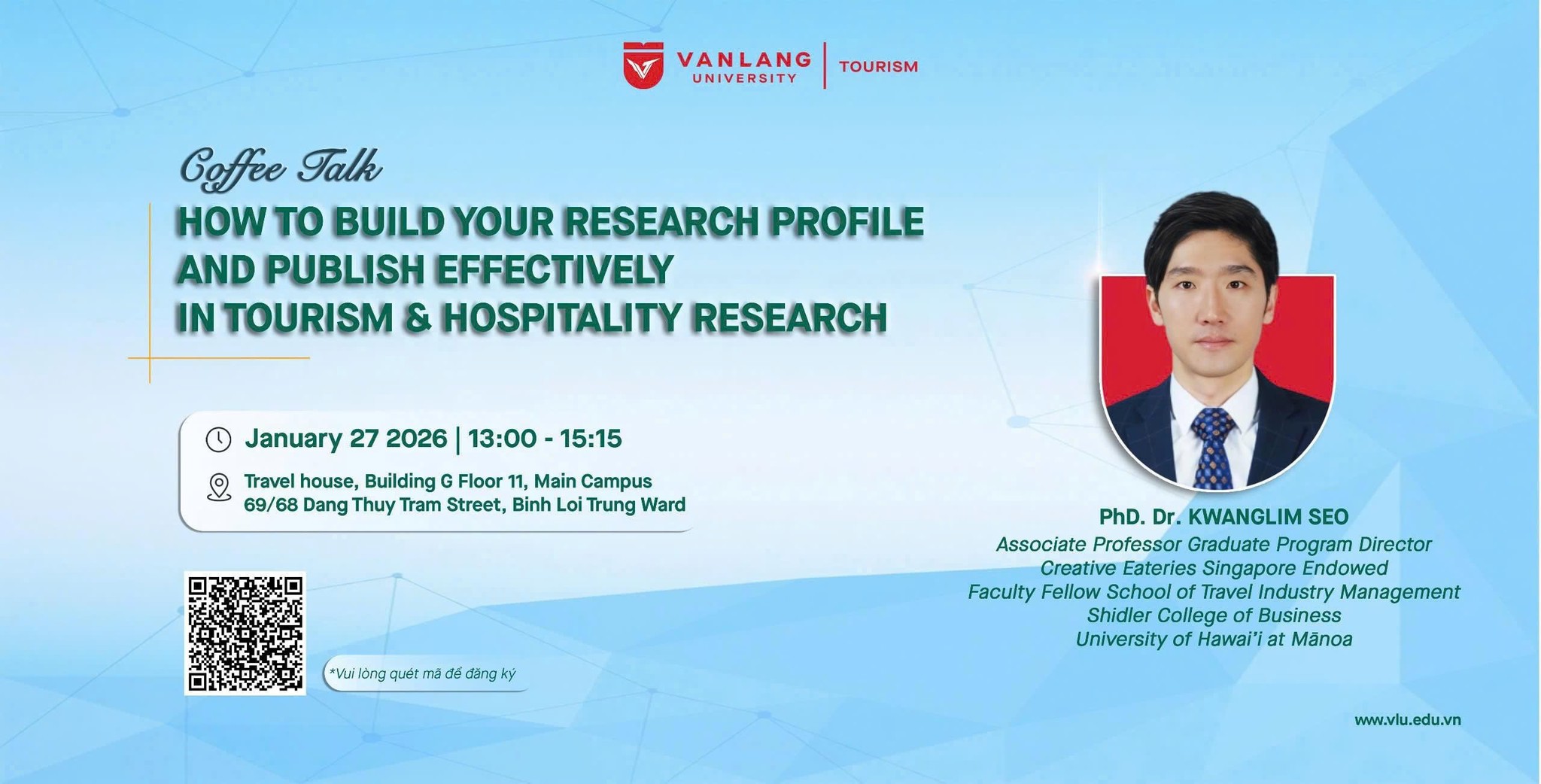 Tăng cường hợp tác Quốc tế hóa và nghiên cứu là một trong những định hướng chiến lược trọng tâm của Khoa Du lịch Trường Đại học Văn Lang. Trong khuôn khổ thúc đẩy hợp tác học thuật quốc tế, Khoa Du lịch vinh dự đón tiếp PGS. TS. Kwanglim Seo đến làm việc và chia sẻ học thuật tại Khoa Du lịch trong hai ngày liên tiếp với hai chương trình chuyên đề đặc biệt.
