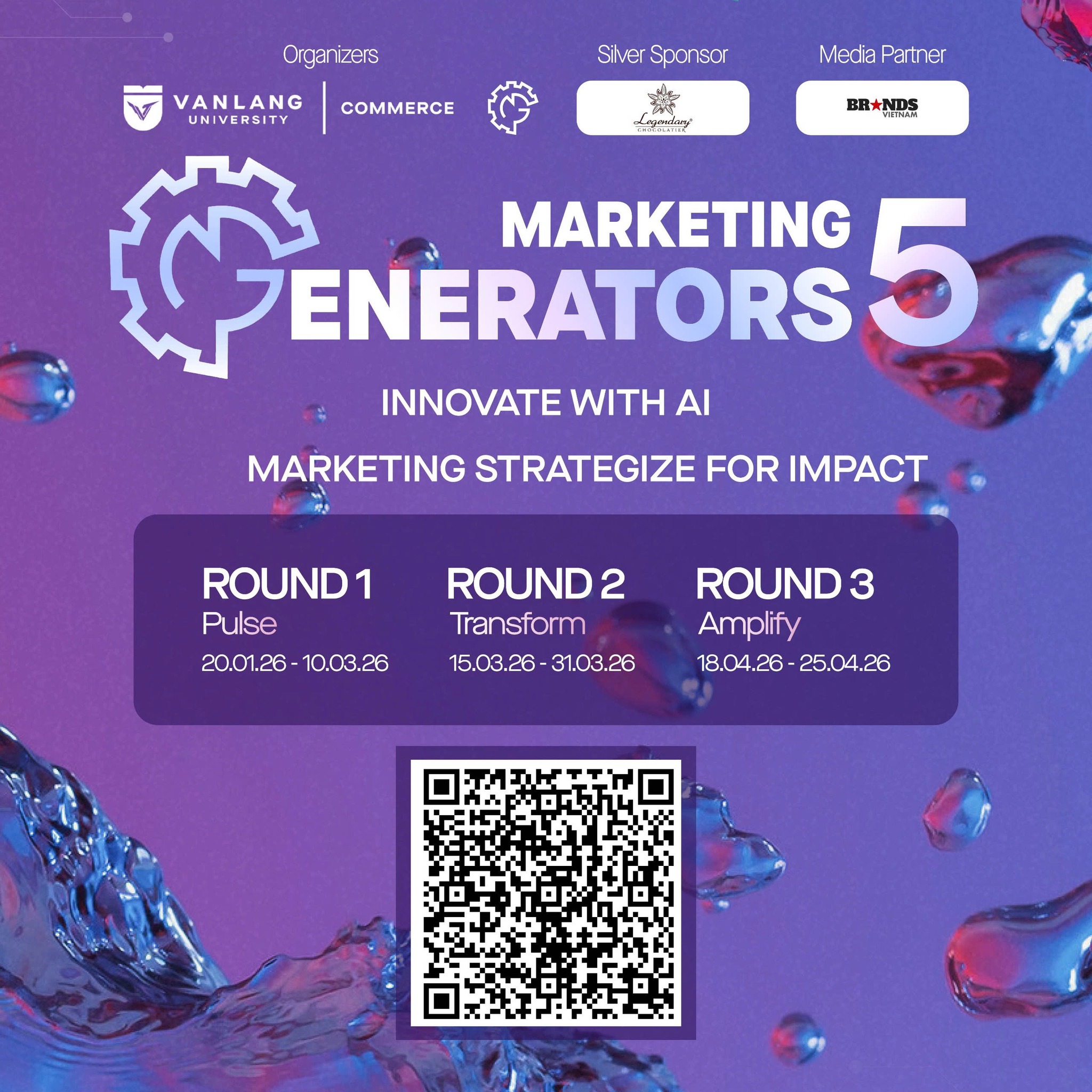 Tiếp nối thành công các mùa trước, Marketing Generators 5 do CLB Margen, Khoa Thương mại, Trường ĐH Văn Lang chính thức trở lại với tổng giá trị giải thưởng 150 triệu đồng. Với chủ đề năm nay, cuộc thi khuyến khích sinh viên hành động cùng AI để kiến tạo các giải pháp Marketing đổi mới, bền vững và có trách nhiệm xã hội, tạo tác động tích cực cho doanh nghiệp và cộng đồng.