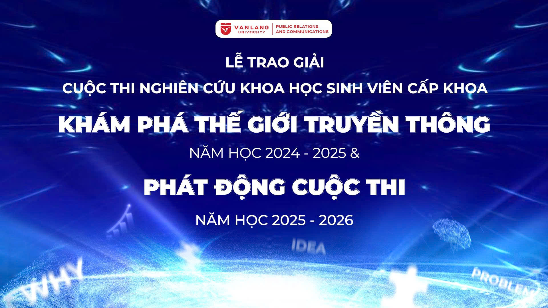 Lễ trao giải Cuộc thi Nghiên cứu Khoa học Sinh viên cấp Khoa - “Khám phá Thế giới Truyền thông” năm học 2024-2025 & Phát động cuộc thi năm học 2025-2026 là sự kiện nhằm tổng kết hành trình cuộc thi, vinh danh các đội thi xuất sắc và đồng thời chính thức khởi động mùa thi mới. Với chủ đề chính: "Insight from Inside" - Khi Trải Nghiệm Cá Nhân Trở Thành Đề Tài Nghiên Cứu Khoa Học, các bạn sinh viên và học viên cao học sẽ hiểu rõ cách triển khai một đề tài nghiên cứu đi từ những trải nghiệm nhỏ nhất trong đời sống thường ngày, giải quyết được nỗi trăn trở to lớn: "Làm thế nào để lựa chọn đề tài nghiên cứu?"