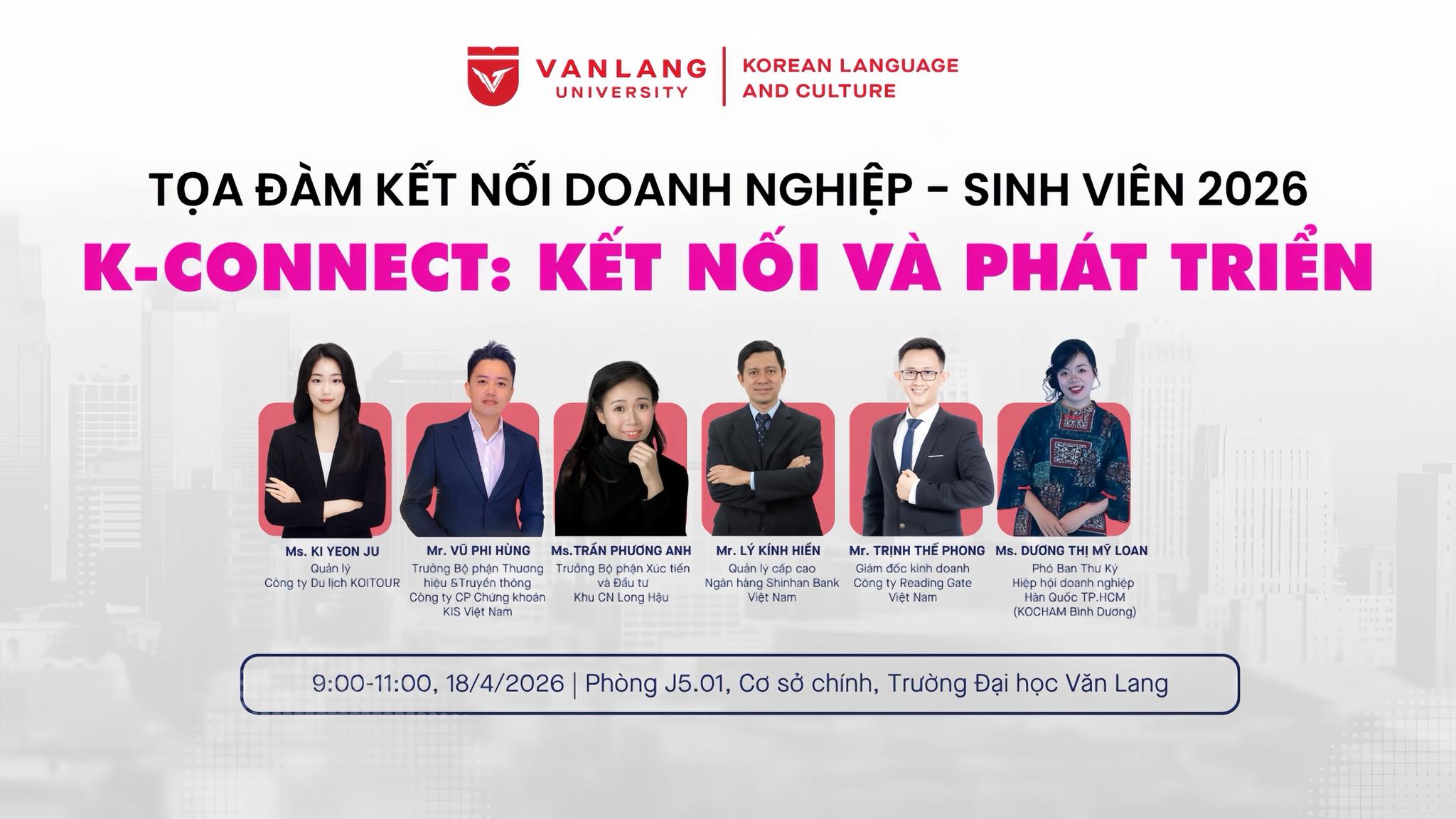 Trong khuôn khổ Job Fair 2026 của Trường Đại học Văn Lang, Khoa Ngôn ngữ và Văn hoá Hàn Quốc tổ chức chương trình tọa đàm K-CONNECT: Kết nối và Phát triển – nơi sinh viên có cơ hội gặp gỡ trực tiếp các doanh nghiệp và chuyên gia đang làm việc trong môi trường Việt – Hàn.